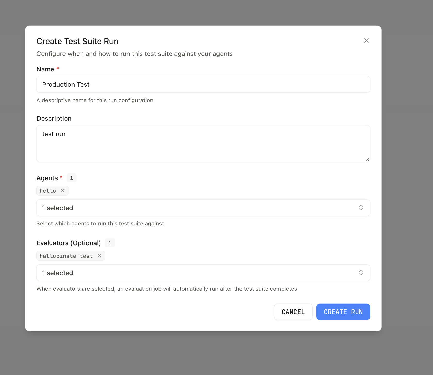Create a run configuration from the test suite detail page (Runs tab). When you start a run, the platform creates a test suite run and processes items. You need at least one item and at least one agent on the configuration before a run can start.